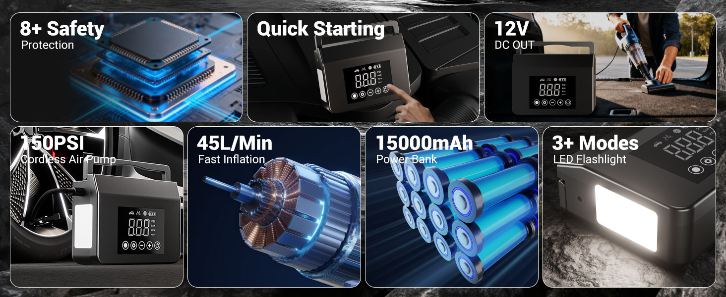 1500omAh is plenty for real emergencies (up to 60 jumps), We focused on value by adding a practicalair compressorinstead ofjust extra battery you mightnever need.